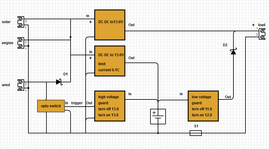 I have battery pack 12V 27Ah (3 x 9Ah) and three electricity sources on my catamaran: